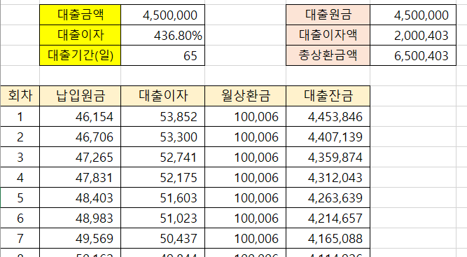 500만원의 경우 10% 수수료를 제외하면 450만원을 대출받습니다. 65일동안 매일 10만원을 상환하면 650만원이 됩니다.