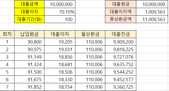 100일동안 10만원을 상환하면 딱 100만원이 됩니다. 11만원을 상환한다면 납부하는 원금의 10%를 더내는 것이기에 어림짐작에 이자는 10% 일 것 같습니다. 11만원씩 100일동안 상환한다면 총 상환금액은 1100만원입니다. 100일동안 100만원을 더 낸 셈이죠.