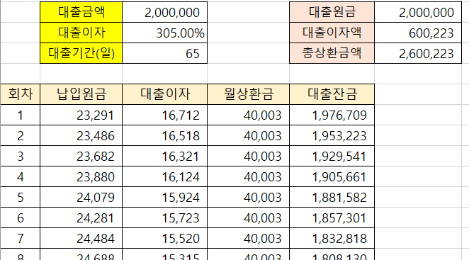 200만원의 경우 10% 수수료를 제외하면 180만원을 대출받습니다. 65일동안 매일 4만원을 상환하면 총 260만원이 됩니다.