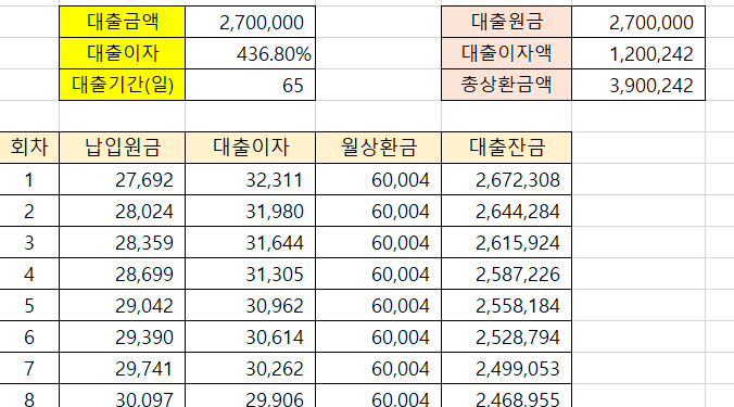 이와 같은 일수대출의 연이율은 원리금균등상환방식으로 하면 놀랍게도 연 70% 가 나옵니다.